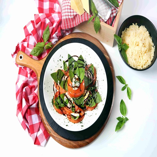 Sliced Tomato, Bocconcini, Basil, Extra Virgin Olive Oil & Balsamic Glaze. Seasoned with Salt & Pepper0